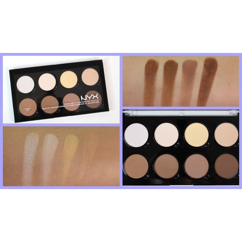 – NYX Highlight & Contour Pro Palette gồm 8 ô màu gồm những tông màu trung tính từ trắng sáng đến nâu sẫm vừa có thể tạo khối, vừa có thể đánh highlight giúp khuôn mặt bừng sáng với những góc cạnh tự nhiên nhất.