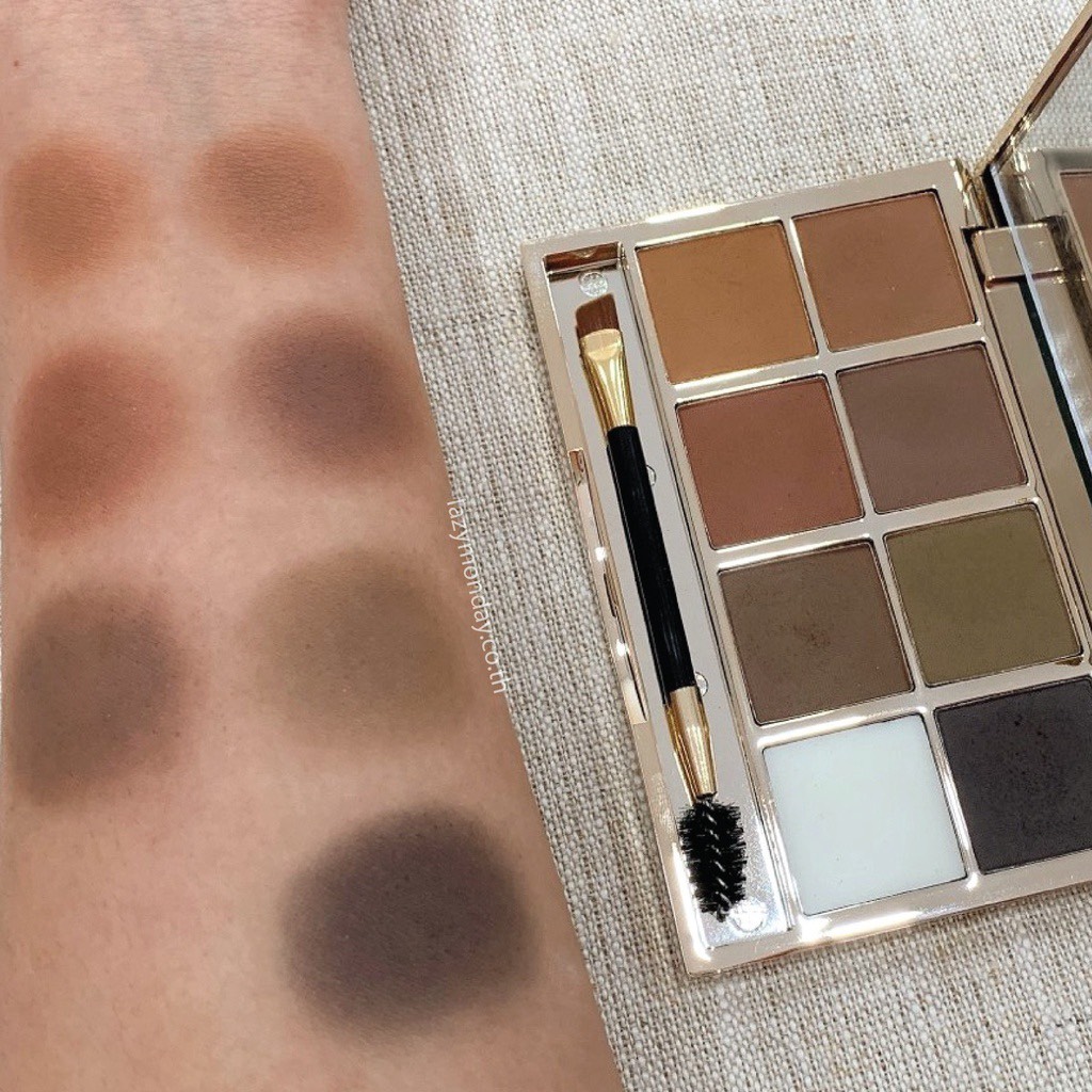 Dùng cọ góc phẳng lấy phấn màu nâu sẫm để định hình khung lông mày theo dáng mong muốn. Chọn tông màu nhạt hơn để tô đều và lấp đầy khoảng trống bên trong lông mày. Sử dụng cọ spoolie lấy sáp trong suốt, chải đều để cố định lông mày vào nếp. Các tông màu trong bảng cũng có thể sử dụng làm phấn mắt, dễ dàng tạo điểm nhấn cho đôi mắt.