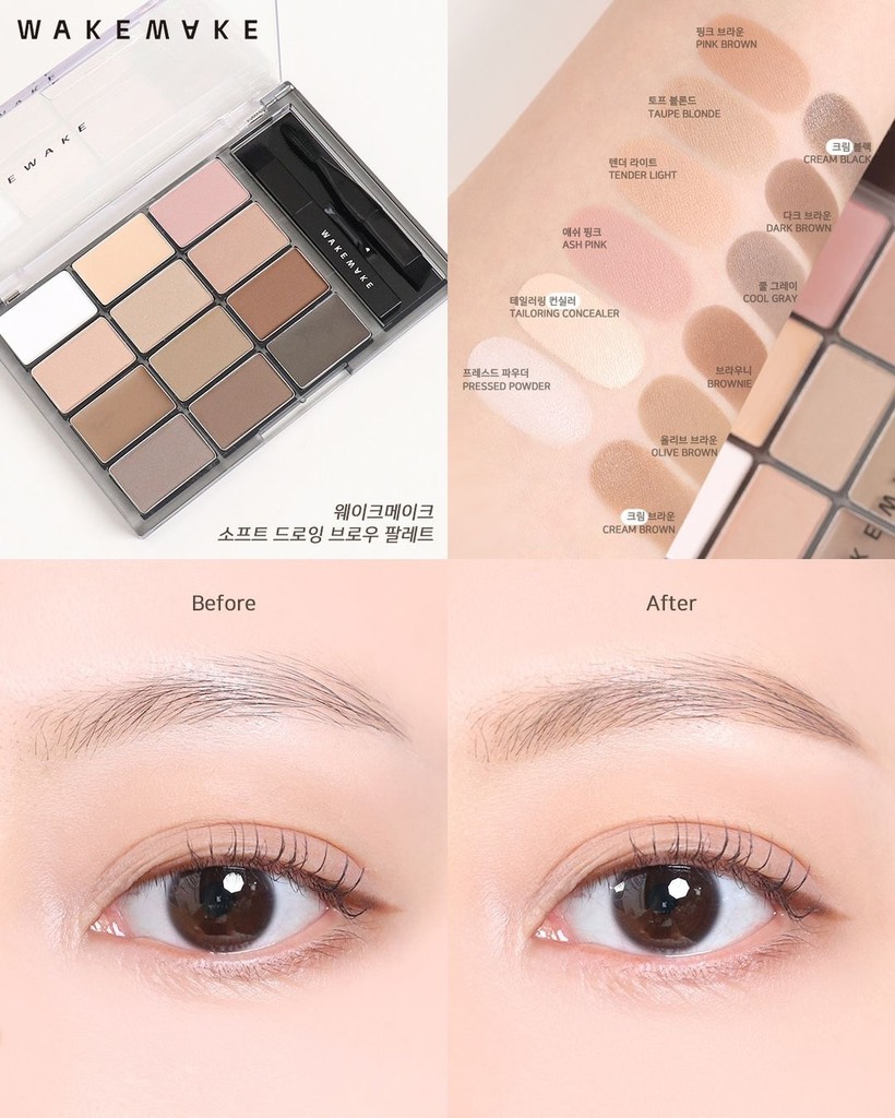 – Với chất phấn mịn, bảng mày Wakemake dễ dàng bám vào lông mày, tạo cảm giác tự nhiên mà không gây bột hay vón cục.