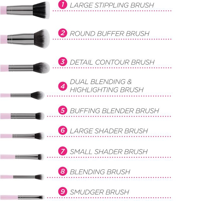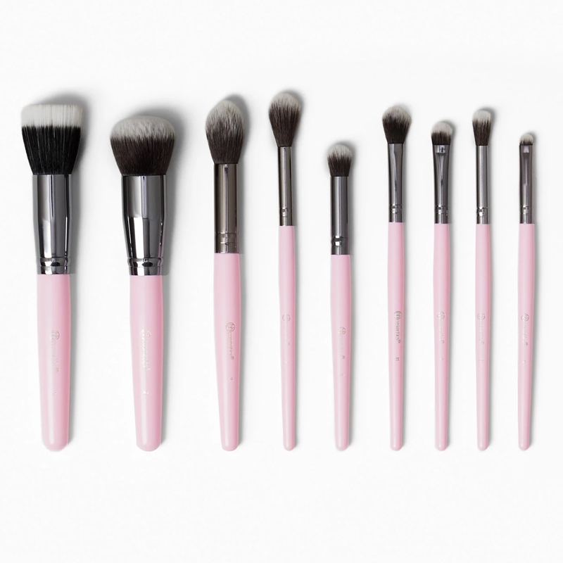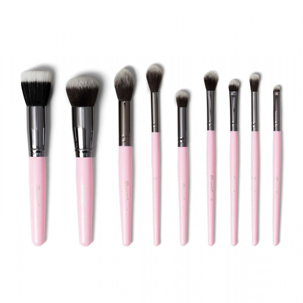 -Với thiết kế xinh xắn màu hồng, bộ cọ gồm 9 cây với nhiều công dụng khác nhau. Bộ cọ có ống đựng có màu hồng rất xinh luôn nhé.