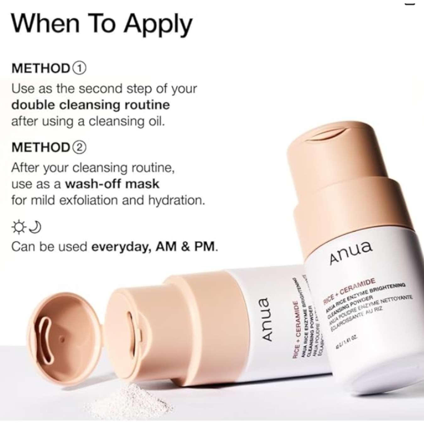– Với thành phần chiết xuất hoàn toàn từ gạo, Anua Rice Enzyme Brightening Cleansing Powder chứa nhiều vitamin và khoáng chất như vitamin B, E cùng các chất chống oxy hóa, góp phần giảm nguy cơ lão hóa, đồng thời tình trạng thâm nám, tan nhang được cải thiện rõ rệt.