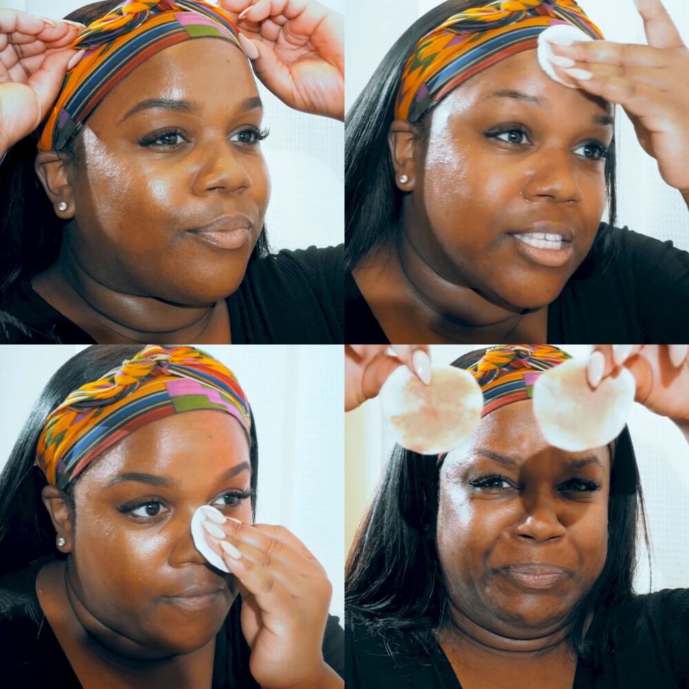 Để tẩy trang vùng mắt, giữ miếng bông trên mắt nhắm trong vài giây, sau đó lau nhẹ. Không cần rửa lại.