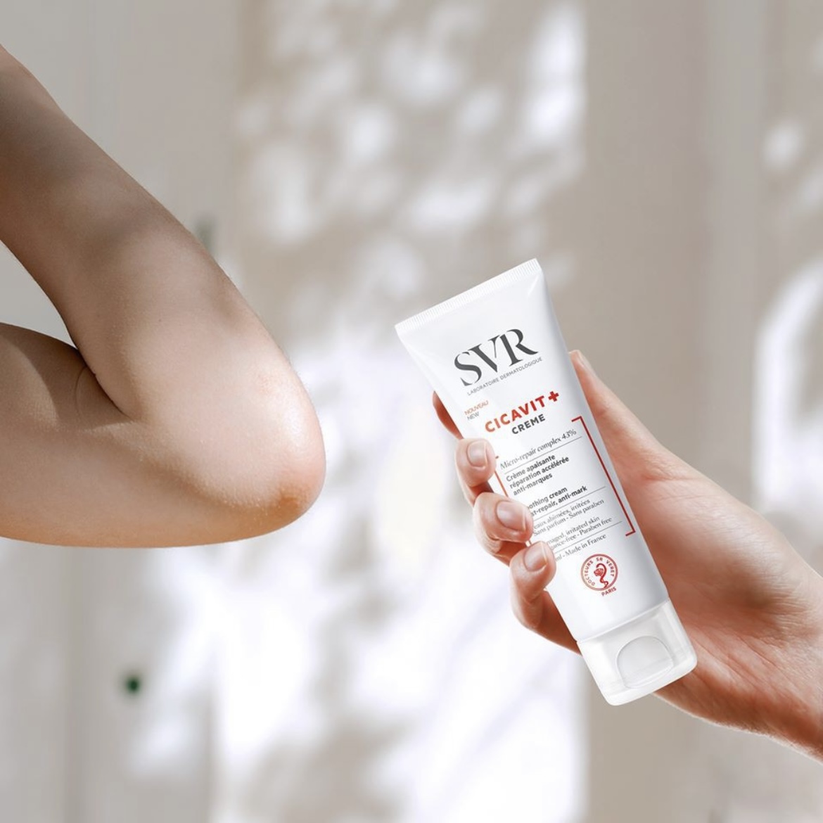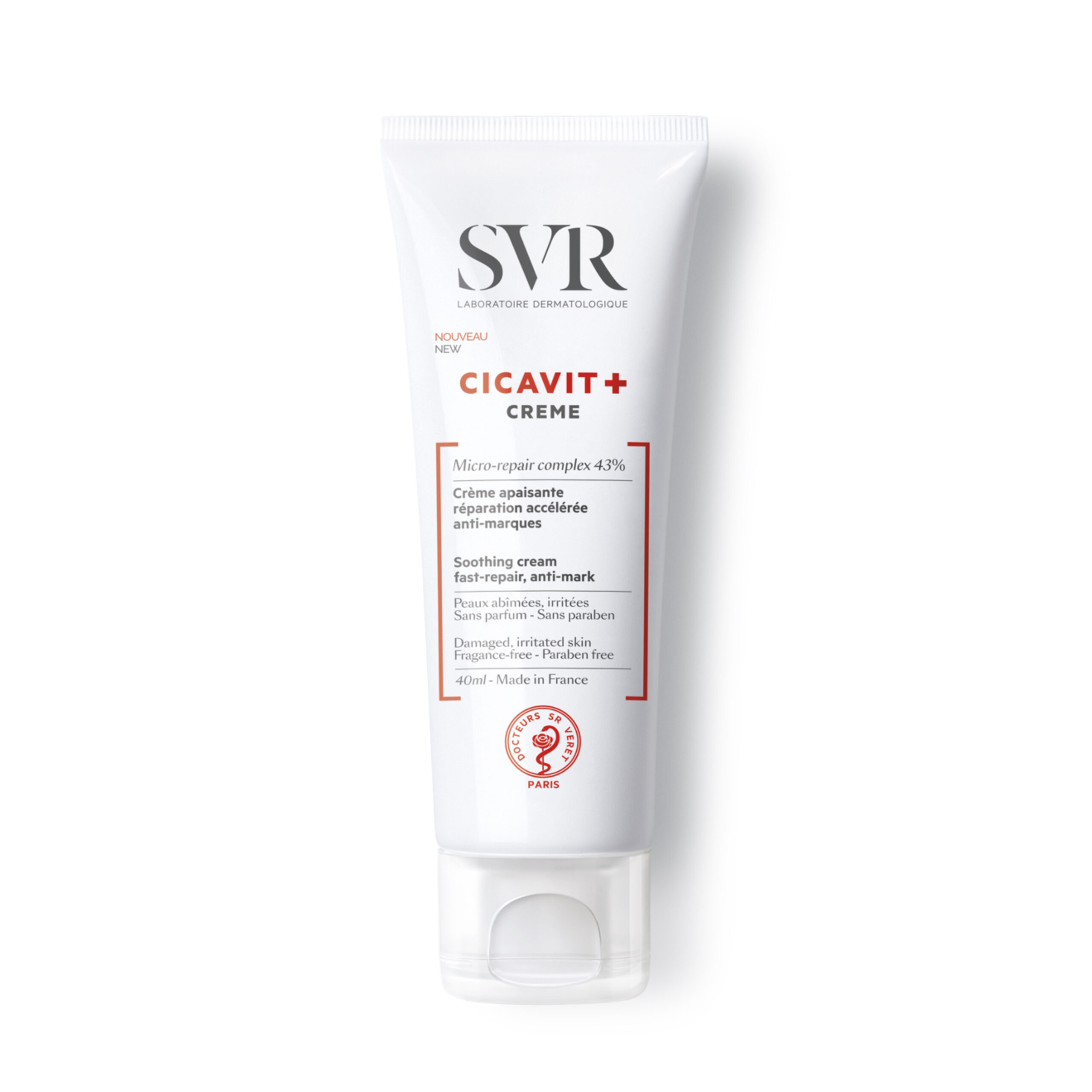 Kem Dưỡng Làm Dịu Da Cho Da Nứt Nẻ Và Mẩn Đỏ SVR Cicavit+ Crème là sản phẩm giúp điều trị, sửa chữa các tổn thương bề mặt da hàng ngày, làm giảm và chữa lành làn da bị tổn thương và kích ứng. Được điều chế với công thức kết hợp độc đáo từ các hoạt chất giúp làm dịu và phục hồi làn da ở nồng độ cao nhất cho da da khô, đỏ rát, nứt nẻ, trầy xước, bỏng, bỏng nắng, tẩy lông, cạo râu.