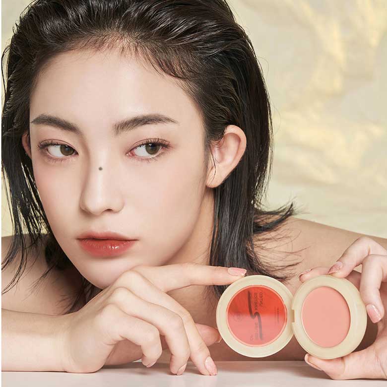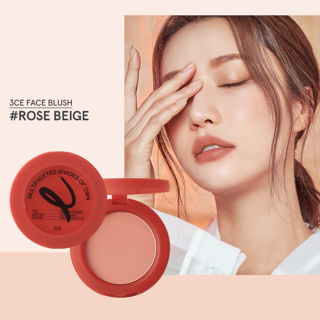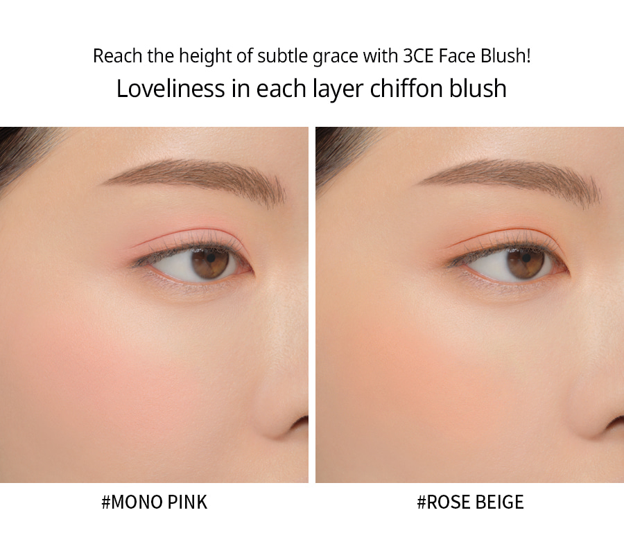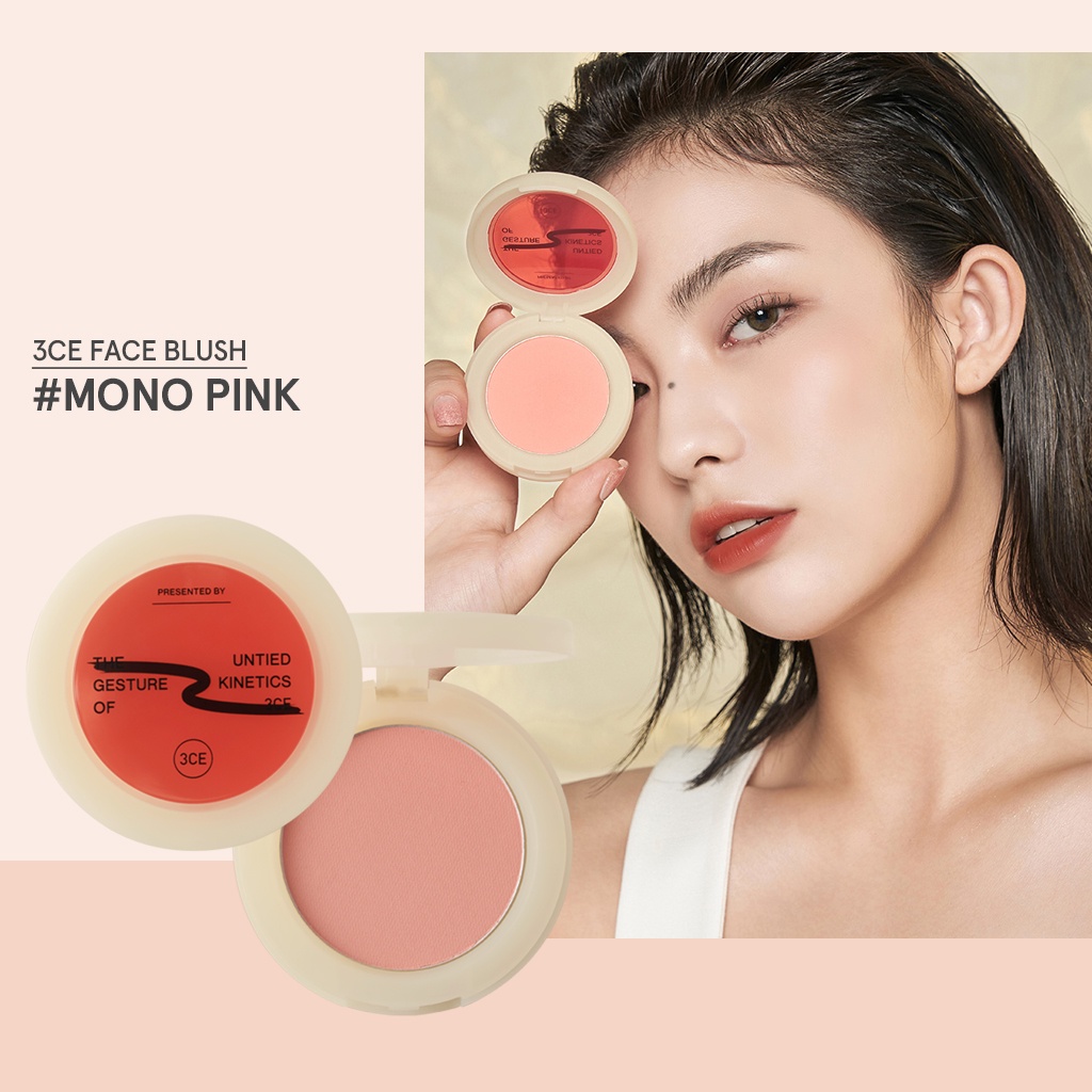Phấn má hồng theo phong cách trang điểm trong suốt và lớp nền tối giản. Đề cao vẻ đẹp của màu sắc và ánh sáng tự nhiên được thể hiện như vẻ đẹp 3CE thường truyền tải.