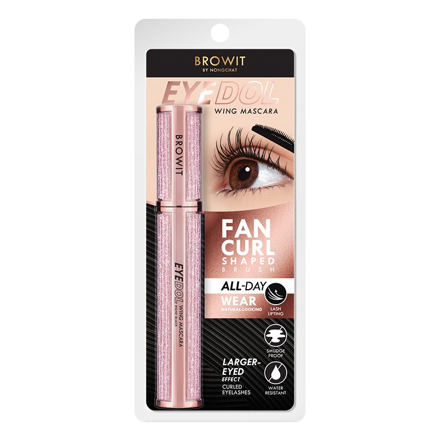 – Browit Eyedol Wing Mascara, công thức mascara giúp mi cong vút. Với đầu cọ hình quạt phù hợp với mọi dáng mắt, có thể chải lên đến tận gốc mi.