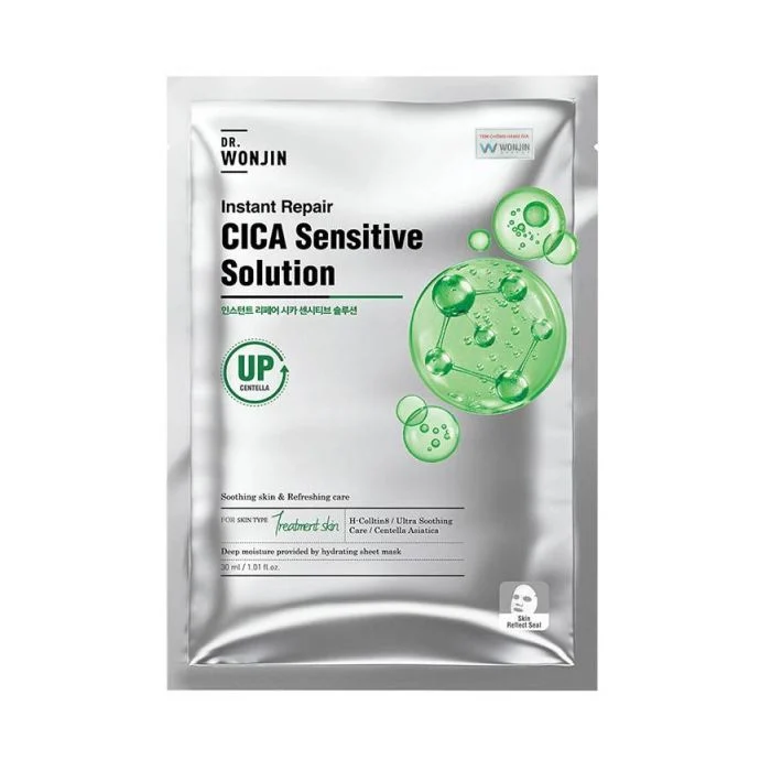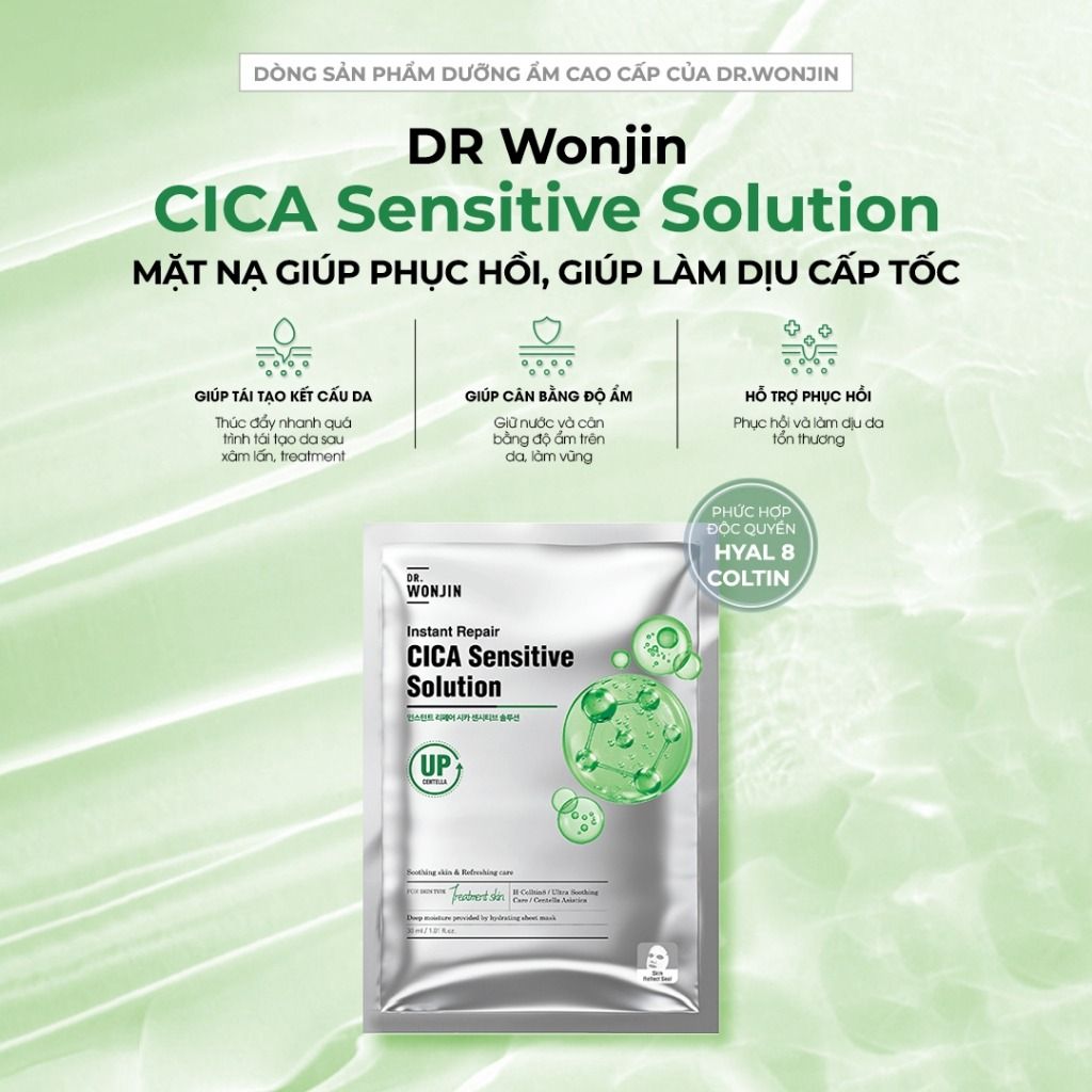 Mặt Nạ Hỗ Trợ Phục Hồi, Làm Dịu Dr.Wonjin Instant Repair Cica Sensitive Solution (Xanh lá): Chứa chiết xuất chanh vàng, rau sam, rau má giúp Cung cấp độ ẩm hỗ trợ phục hồi và làm dịu da tổn thương, tăng cường hàng rào bảo vệ da, hỗ trợ giảm thâm mờ sẹo và làm đều màu da, tăng cường hàng rào bảo vệ da.