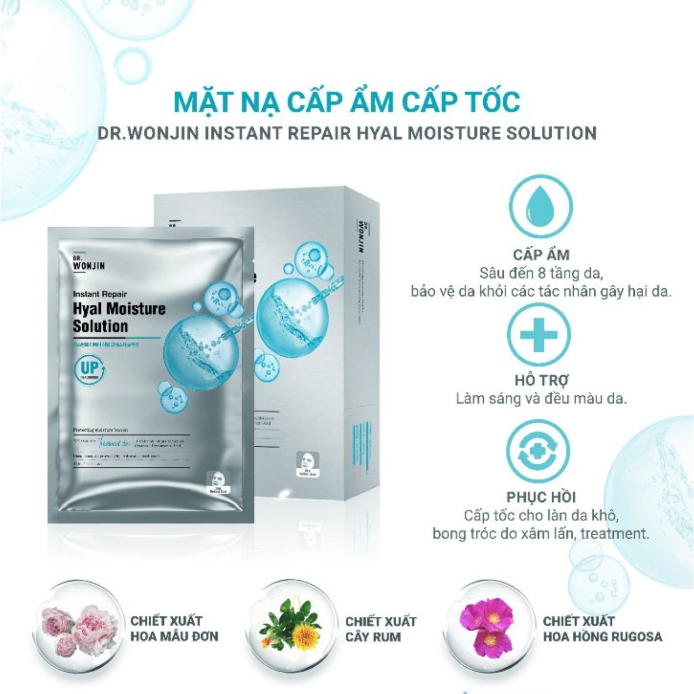Mặt Nạ Cấp Ẩm Dr.Wonjin Instant Repair Hyal Moisture Solution (Xanh Dương): Cấp ẩm tức thì và chuyên sâu đến 8 tầng da, bảo vệ da khỏi các tác nhân gây hại, hỗ trợ làm sáng và đều màu da. Phù hợp dành cho làn da khô, da xâm lấn, treatment.