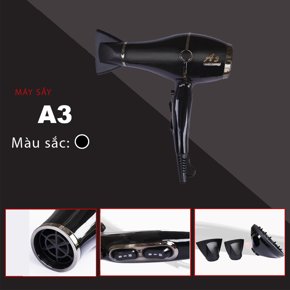– Máy sấy tóc A3 được thiết kế độc đáo tập trung luồng gió mạnh không chỉ giúp bạn tiết kiệm thời gian mà còn tạo được nhiều kiểu tóc đẹp, đầu sấy tạo kiểu giúp tóc khô nhanh và tạo kiểu tóc dễ dàng.