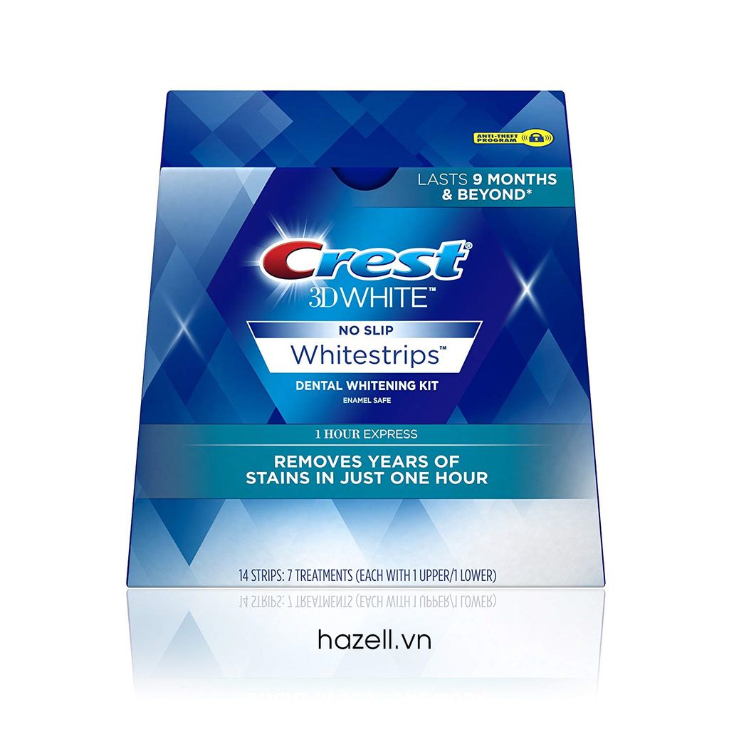 Crest 3D White 1-Hour Express là sản phẩm miếng dán làm trắng răng đặc biệt của Crest với sức mạnh làm trắng tương tự như dòng sản phẩm miếng dán mạnh nhất hiện nay Crest 3D White Professional Effects, nhưng được thiết kế để sử dụng trong trường hợp người dùng cần làm trắng cấp tốc trong ngày, và chỉ cần dán 1 lần mỗi tháng. Crest 3D White 1-Hour Express có khả năng loại bỏ mảng bám gây vàng răng lâu năm và giúp bề mặt răng trở nên trắng sáng rõ rệt chỉ sau hơn 1 giờ sử dụng. Hoạt chất làm trắng được chứng nhận bởi FDA Hoa Kỳ của Crest 3D White 1-Hour Express an toàn tuyệt đối cho men răng.