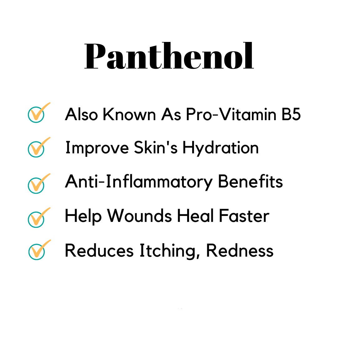 Cơ chế hoạt động: Provitamin B5 (Panthenol) là dẫn xuất rượu của axit pantothenic, sử dụng ổn định và dễ dàng hấp thụ, một khi thấm vào da, nó nhanh chóng chuyển hóa thành Vitamin B5( Pantothenic Acid).