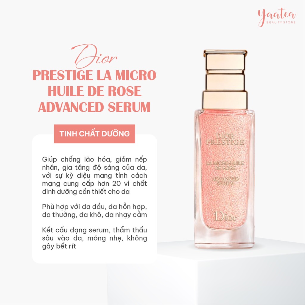 – Với kết cấu mềm mại, giàu dưỡng chất nhưng thẩm thấu nhanh, Serum Dior Prestige La Micro-Huile De Rose mang đến cảm giác nhẹ nhàng, dễ chịu ngay từ lần chạm đầu tiên. Làn da sẽ trở nên mịn màng, săn chắc và rạng rỡ hơn, cải thiện rõ rệt các vấn đề về lão hóa, mang đến vẻ đẹp tươi trẻ lâu dài.