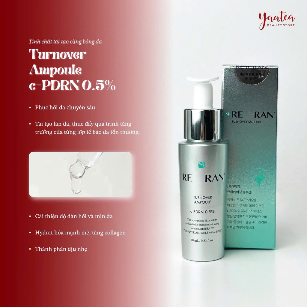 REJURAN – Serum Turnover Ampoule c-PDRN 0.5% 10ml một dạng phân tử dạng ngắn của ADN và giống với ADN ở con nguoi đến 95% đã được khoa học chứng minh là có khả năng kì diệu trong việc làm sống lại các tế bào đã chết cũng như khả năng tuyệt vời trong việc tự sửa chữa các tổn thương và vết thương trong ngoài cơ thể cũng như trên da nhờ cơ chế kích thích tăng sinh tế bào da, collagen glycosaminoglycans và glycoprotein