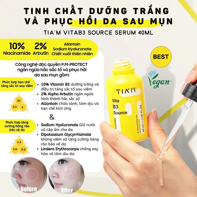 – Nhờ vào nồng độ vitamin cao, Tiam Vita B3 Source Serum giúp giảm thâm, làm sáng da và cải thiện tình trạng da không đều màu, mang lại làn da khỏe mạnh và rạng rỡ.
