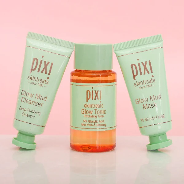 BỘ BA SẢN PHẨM SKINCARE MINI TRẮNG SÁNG ĐẾN TỪ PIXI. Bộ ba du lịch thiết yếu này mang lại làn da sáng hơn, sạch hơn trong 3 bước nhanh chóng! Loại bỏ tạp chất, bụi bẩn bằng Sữa rửa mặt Glow Mud làm sạch sâu, tẩy tế bào chết nhẹ nhàng và làm sáng bằng Glow Tonic nổi tiếng và giải độc bằng Mặt nạ bùn Glow.