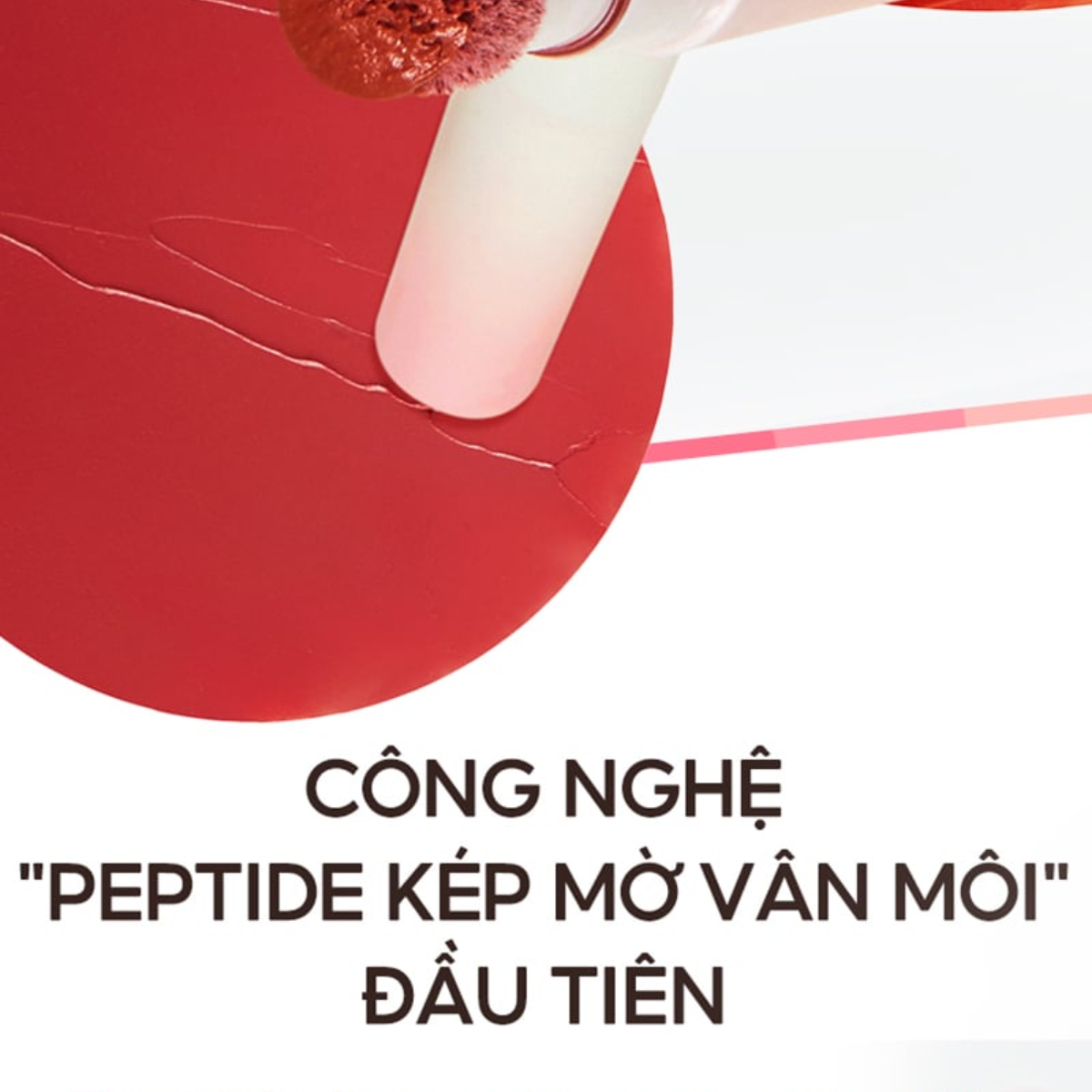 – Son có hiệu ứng che khuyết điểm rãnh môi nhưng không gây khô môi. Nhờ công nghệ Peptide kép giúp làm mờ rãnh môi cho bờ môi mịn màng, cùng với 68% thành phần mịn môi