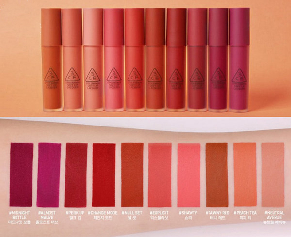 # Bảng màu của dòng son kem lì 3CE Soft Lip Lacquer gồm có 10 màu: