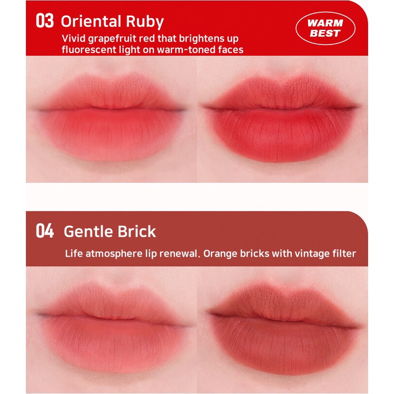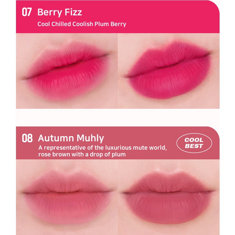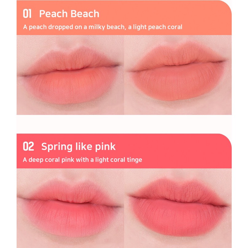 – Khi mới thoa sẽ để lại lớp tint bóng, nhưng nó sẽ chuyển sang mờ dần theo thời gian nhưng vẫn để lại lớp Finish đẹp, không bị đổi màu.