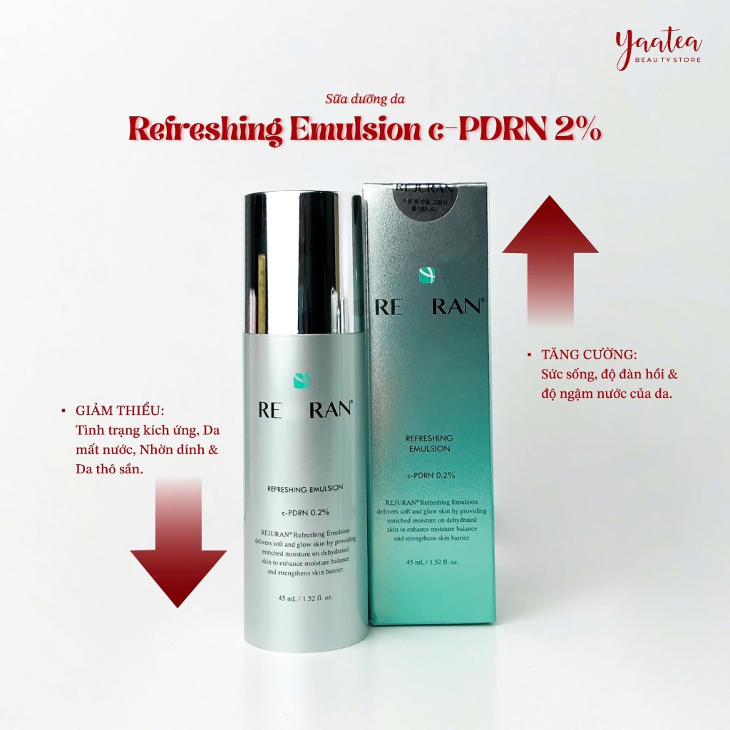 Sữa Dưỡng REJURAN Refreshing Emulsion c-PDRN 0.2% 45ml một liệu pháp chăm sóc hàng ngày không thể thiếu để phục hồi làn da của bạn. Được bào chế để dưỡng ẩm sâu mà không làm da bị nặng, loại sữa dưỡng mỏng nhẹ này hoàn hảo để mang lại cho làn da của bạn vẻ rạng rỡ tự nhiên, lâu dài.