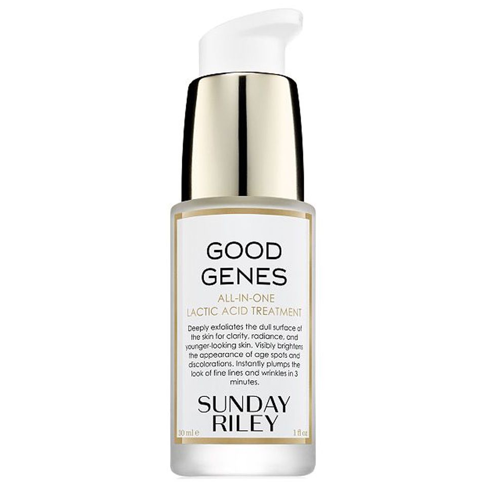 Good Genes Lactic Acid Treatment, một trong hai sản phẩm làm nên tên tuổi của Sunday Riley (cùng với Luna Sleeping Oil) là một sản phẩm toàn diện với thành phần chính Lactic Acid (một loại AHA), giúp làm sạch sâu, mịn da và tái tạo da. Good Genes được chứng minh lâm sàng cho thấy khả năng tẩy da chết hoá học trên bề mặt da cho một làn da sạch mịn, sáng và trẻ hơn. Điều này là nhờ công thức chứa Lactic Acid nồng độ cao và tinh khiết, bên cạnh đó Licorice (chiết xuất cam thảo) giúp mờ thâm, nám và làm sáng da.